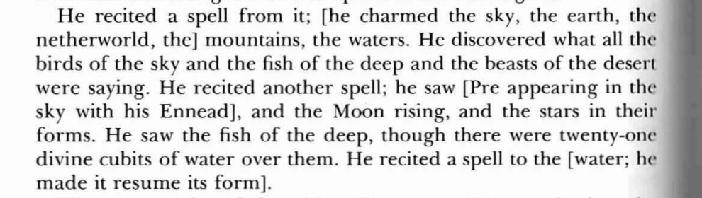 “When you [recite the first spell you will] charm the sky, the earth, the netherworld, the mountains and waters. You will discover what all the birds of the sky and all the reptiles are saying.” — from Stories of the High Priests of Memphis1